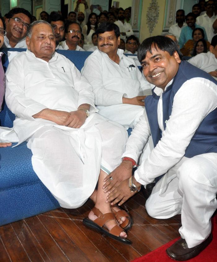लखनऊ. यूपी के मुख्यमंत्री अखिलेश यादव के आठवें कैबिनेट विस्तार में आज अजीबो-गरीब नजारा देखने को मिला। अवैध खनन के आरोप में मंत्रीमण्डल से हटाए गए गायत्री प्रजापति ने दोबारा कैबिनेट मंत्री पद की शपथ लेते ही मुलायम के पैरों पर गिर गए। प्रजापति उनके पैर पकड़कर काफी देर तक जमीन पर ही बैठे रहे। इतना ही नहीं, गायत्री प्रजापति ने शपथ के बाद सीएम अखिलेश यादव के पैर भी 3 बार छुए। हालांकि राज्यपाल राम नाईक को यह बात नागवार गुजर गई। उन्होंने तुरंत टोकते हुए अनुशासन बनाए रखने की बात कही।