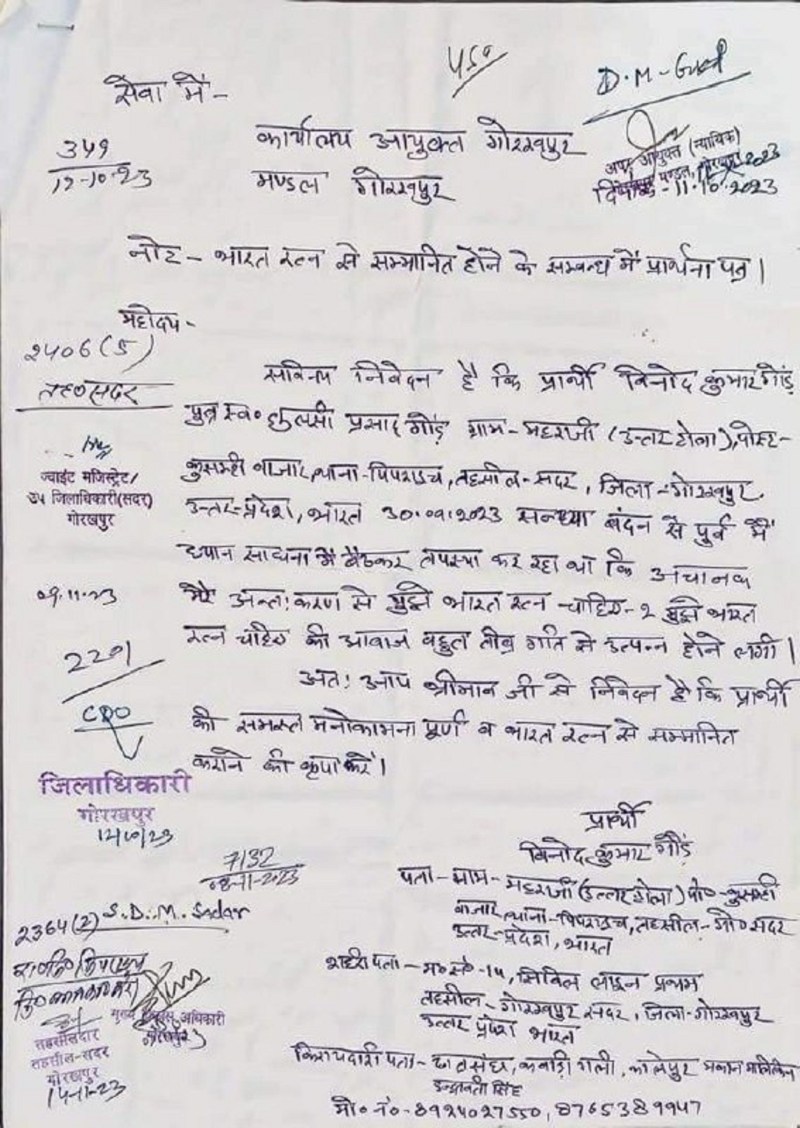 UP NEWS: आयुक्त महोदय, मै शाम को संध्या वंदन करके ध्यान साधना कर रहा था। तभी मेरे अंत:करण से बारंबार आवाज आने लगी कि मुझे भारत रत्न चाहिए-मुझे भारत रत्न चाहिए। महोदय से प्रार्थना है कि कृपया मुझे भारत रत्न दिलाने की कृपा करें। यह लाइने उस आवेदन पत्र का मजमून हैं जिसे गोरखपुर के एक व्यक्ति ने मंडलाआयुक्त गोरखपुर को लिखा है। इतना ही नहीं, उसने जिले के छोटे से लेकर बड़े अधिकारियों तक को अपना पत्र भेजकर बकायदा मुहर भी मरवा लिया है।