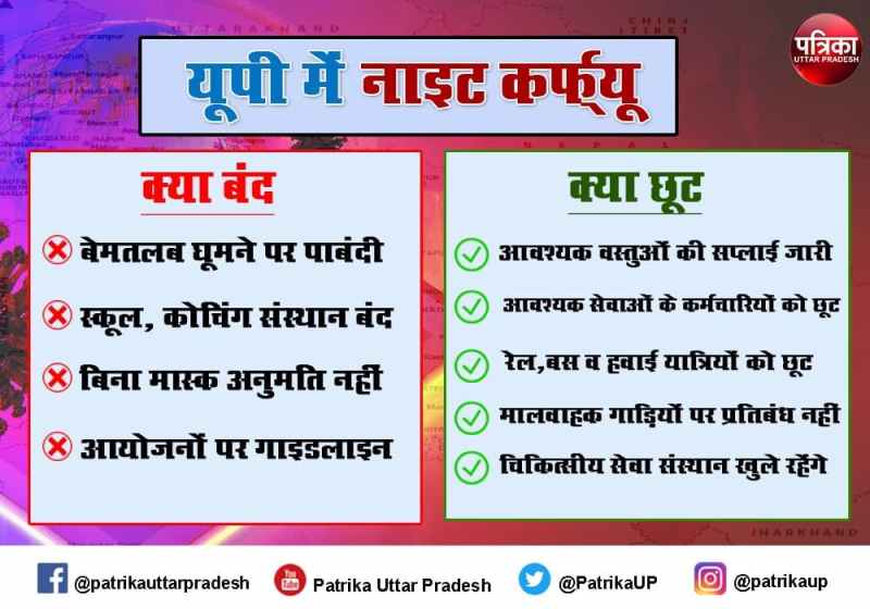 लखनऊ. उत्तर प्रदेश में कोरोना वायरस (Coronavirus) का संक्रमण तेजी से बढ़ता जा रहा है। वायरस की रफ्तार थामने के लिए योगी आदित्यनाथ (Yogi Adityanath) सरकार एक ओर जहां कोराना वैक्सीनेशन (Corona Vaccination) पर फोकस कर रही है वहीं, फोकस टेस्टिंग (Focus Testing) और कान्ट्रैक्ट ट्रेसिंग (Contact Tracing) पर खासा ध्यान दिया जा रहा है। लेकिन, हर दिन संक्रमित मरीजों व मृतकों की संख्या में हो रहा इजाफा परेशान करने वाला है। अस्पताल, श्मसान फुल होते जा रहे हैं और बाजारों में जुट रही भीड़ कम होने का नाम नहीं ले रही है। कोरोना के खतरे के प्रति लोगों की लापरवाही को देखते हुए राजधानी लखनऊ, कानपुर, वाराणसी और प्रयागराज के शहरी क्षेत्रों में आज से रात्रि कर्फ्यू (Night Curfew) लगा दिया गया है। इसके अलावा, गाजियाबाद, गौतमबुद्धनगर, मेरठ समेत कई जिलों में नाइट कर्फ्यू पर स्थानीय प्रशासन जल्द फैसला ले सकता है। नाइट कर्फ्यू रात नौ से सुबह छह बजे तक रहेगा। इस दौरान उन्हीं लोगों को आवागमन की अनुमति मिलेगी, जिनका बाहर निकलना जरूरी होगा। आइए जानते हैं कि रात्रि कर्फ्यू के दौरान क्या खुलेगा और क्या बंद रहेगा और किसको आने-जाने की छूट मिलेगी।