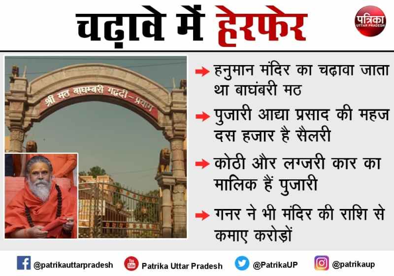 mahant narendra giri death mystery प्रयागराज. मंहत नरेंद्र गिरि की मौत के मामले की जांच कर रही एसआइटी ने खुलासा किया है कि बाघंबरी मठ और हनुमान मंदिर के चढ़ावे में बहुत हेरफेर होता था। भक्तों के दान में महंत नरेंद्र गिरि के साथ रहने वाला गनर अभिषेक मिश्रा और हनुमान मंदिर का मुख्य पुजारी आद्या प्रसाद तिवारी भारी हेरफेर करते थे। पुजारी की सैलेरी महज 10 हजार रुपए प्रतिमाह थी। लेकिन, वह करोड़पति है। मठ और मंदिर की संपत्ति में करोड़ों का हेरफेर करके महंत का गनर अभिषेक भी दो साल में करोड़पति बन गया।