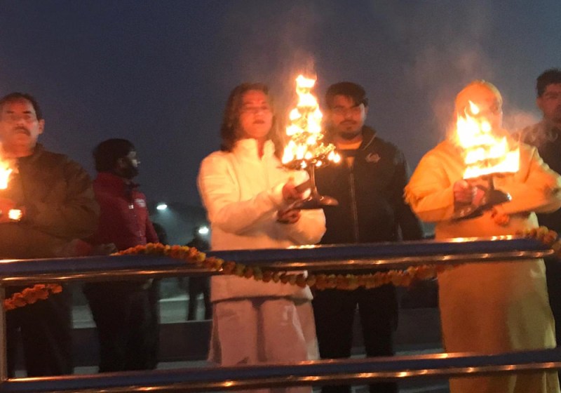 वाराणसी के ओमा महाराज व आनंद नारायण महाराज के सानिध्य में हुई आरती में अध्यक्ष डॉ0 प्रवीण ने बताया कि महाआरती के बाद घाट पर जगमगाते 501 दीपो से सभी भक्तों को नशा व अपराध मुक्त भारत बनाने का संकल्प कराया गया। बाद में भक्तों ने संकल्पित दीपो का जल प्रवाह करके दीपदान किया।