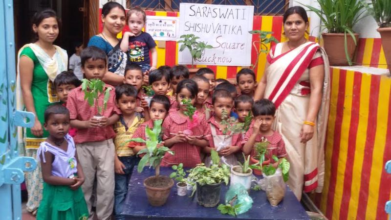 स्थित सरस्वती शिशु वाटिका में स्कूली बच्चों ने पौधे लगाए और पेड़ों का