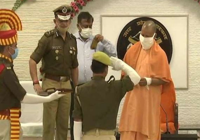 शुक्रवार को अपने सरकारी आवास पर पीएसी कॉन्स्टेबल को प्रोन्नत पत्र प्रदान करते सीएम योगी