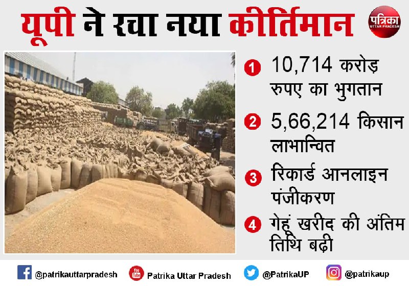लखनऊ. Uttar Pradesh Govt Set To Break Own Record For Wheat Procurement यूपी सरकार ने सरकारी गेहूं खरीद में एक नया कीर्तिमान रच दिया है। वर्ष 2018-19 में अपने ही रिकार्ड को तोड़ कर इस वर्ष 2021-22 में अब तक 54.25 लाख मीट्रिक टन गेहूं खरीद का नया रिकार्ड बनाया है। वर्ष 2018-19 में 52.92 लाख मीट्रिक टन गेहूं खरीदा गया था। इसके साथ ही कोरोना काल की दिक्कतों को देखते हुए योगी सरकार ने गेहूं खरीद की अंतिम तिथि एक सप्ताह बढ़ाकर 22 जून कर दिया है। वैसे अब तक अंतिम तिथि 15 जून थी।