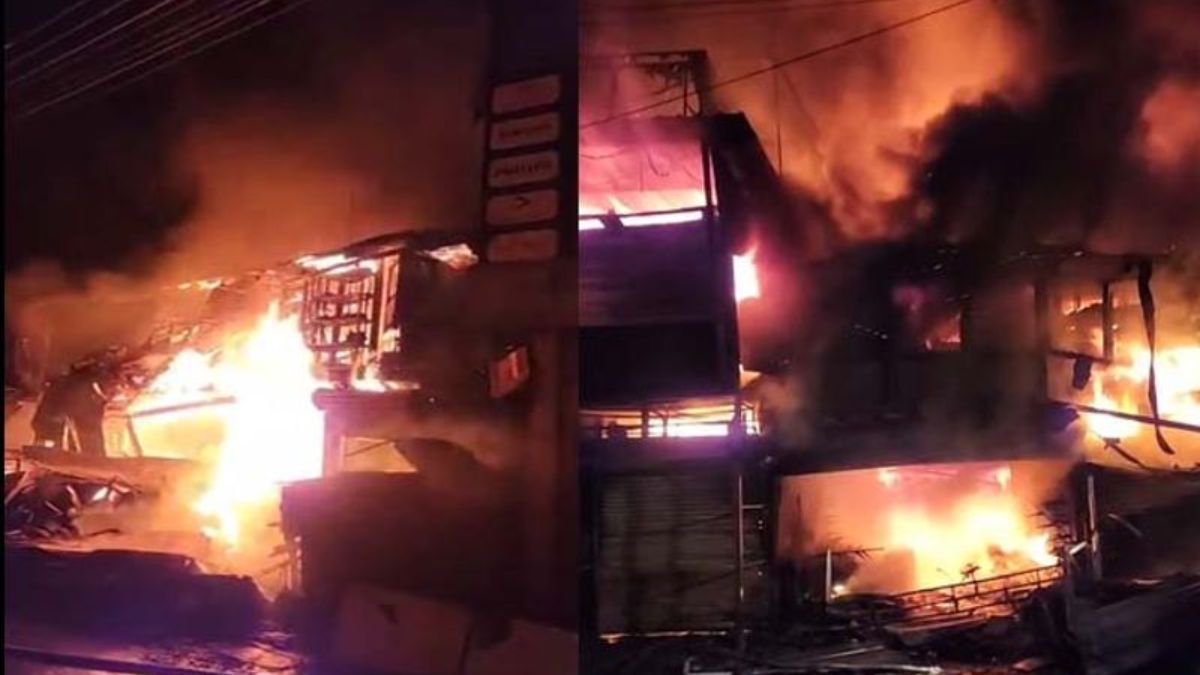 Massive Fire: भीषण अग्निकांड से नया बाजार में भगदड़ मच गई। ये घटना उत्तराखंड के हल्द्वानी शहर के नया बाजार में घटी है। बताया जा रहा है कि ताज चौराहे के पास शाम करीब 7:45 बजे सुबोध गुप्ता की लेदर अटैची की दुकान में अचानक आग भड़क उठी। आग की लपटें उठती देख आसपास के लोगों ने पुलिस और दमकल विभाग को सूचना दी। देखते ही देखते आग ने विकराल रूप अख्तियार कर लिया था। आग की लपटें आसमान छूने लगी थी। चंद पलों में ही आग ने पड़ोस के दानिश की बाबा शूज, रॉयल टच रेडीमेड गारमेंट्स, गांधी आश्रम, सरदार क्लॉथ हाउस समेत पांच दुकानों को चपेट में ले लिया। फायर ब्रिगेड के पहुंचने से पहले ही पांच दुकानें खाक हो चुकी थी।