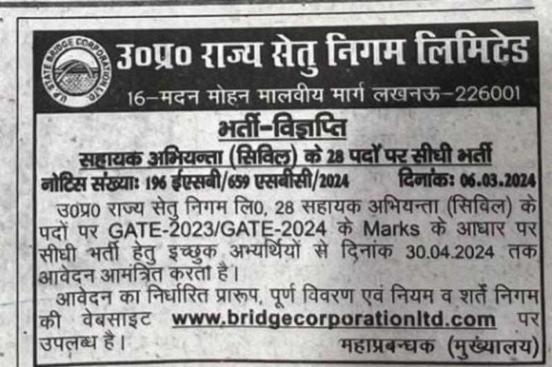 विज्ञापन में लिखा है सिर्फ इंटरव्यू दो और सेतु निगम में सहायक अभियंता बनो। विज्ञापन में आगे लिखा है उप्र राज्य सेतु निगम लि0, 28 सहायक अभियन्ता (सिविल) के पदों पर GATE-2023/GATE-2024 के Marks के आधार पर सीधी भर्ती हेतु इच्छुक अभ्यर्थियों से दिनांक 30.04.2024 तक आवेदन आमंत्रित करती है। आवेदन का निर्धारित प्रारूप, पूर्ण विवरण एवं नियम व शर्तें निगम की वेबसाइट www.bridgecorporationltd.com पर उपलब्ध है। इसके नीचे महाप्रबंधक (मुख्यालय) लिखा है।