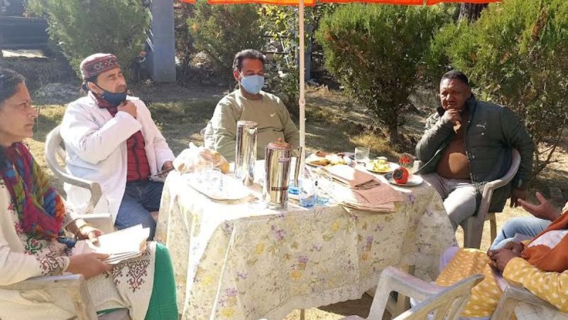 जागेश्वर मंदिर की करोड़ों की भूमि खुर्दबुर्द होने के मामले में बैठक करते लोग