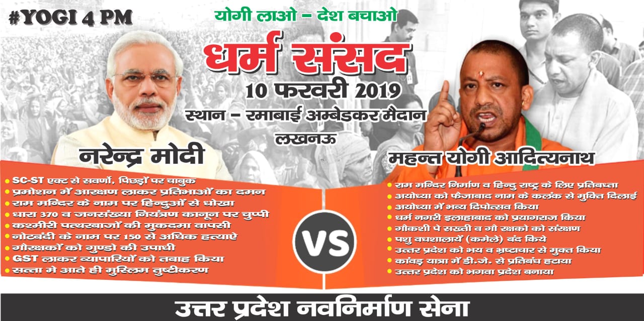 पोस्टर में 10 फरवरी को रमाबाई अम्बेडकर मैदान में धर्मसंसद के आयोजन की जानकारी दी गयी है। पोस्टर में मोदी और योगी के चित्र भी बनाये गये हैं। मुख्यमंत्री निवास के पास लगे होर्डिंग्स में नरेंद्र मोदी के चित्र के नीचे राम मंदिर निर्माण के नाम पर हिन्दुओं से धोखा,एससीएसटी ऐक्ट से सवर्णो पर चाबुक,प्रमोशन में आरक्षण लाकर प्रतिभाओं का दमन,धारा 370 और जनसंख्या नियंद्वण पर चुप्पी,कश्मीरी पत्थरबाजों पर से मुकदमें की वापसी,नोटबन्दी से 150 लोगों की मृत्यु,गौरक्षकों को गुण्डों की उपाधि, जीएसटी से व्यापारियों की तबाही और सत्ता में आते ही मुस्लिम तुष्टीकरण जैसे स्लोगन लिखे हैं।