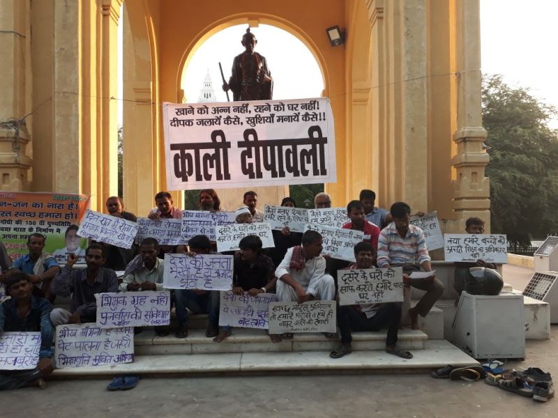 लखनऊ. दीपावली के दिन जब पूरा प्रदेश दीपांजलि और पटाखों-फुलझड़ियों के साथ उत्सव मना रहा था तब लखनऊ के हजरतगंज स्थित गांधी प्रतिमा पर शाम को भिक्षावृत्ति मुक्ति अभियान के सदस्यों के साथ भिक्षुकों ने काली दीपावली मनाई। भिक्षुकों के पुनर्वास की मांगों को लेकर दीपावली की शाम काली दीपावली कार्यक्रम मनाया गया। इस अवसर पर बदलाव संस्था के संरक्षक रेमन मैग्सेसे अवार्डी डाक्टर संदीप पांडेय, भिक्षावृत्ति मुक्ति अभियान संयोजक शरद पटेल, महेंद्र प्रताप और भिक्षावृत्ति मुक्ति अभियान के प्रयास से भीख मांगना छोंड़कर पुनर्वास के प्रयास में जुटे 22 लोग मौजूद रहे।
