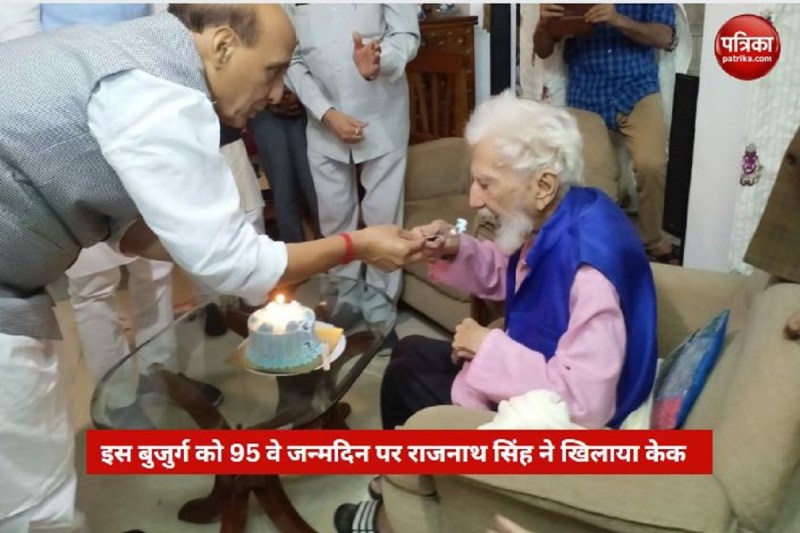 (बाएं) राजनाथ सिंह (दाएं) पंडित यज्ञ शर्मा को केक खिलाते हुए