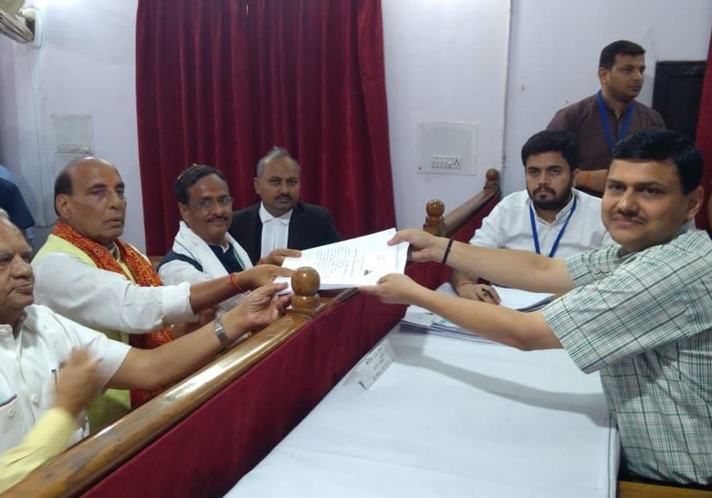 अपने रोड शो के बाद नामांकन के लिए राजनाथ सिंह पार्टी कार्यकर्ताओं के साथ शुभ मुहूर्त में जिलाधिकारी के दफ्तर होते हुए कलेक्ट्रेट ऑफिस पहुंचे। इस दौरान उनके साथ डिप्टी सीएम डॉ. दिनेश शर्मा, वरिष्ठ अधिवक्ता हाईकोर्ट एलपी मिश्रा, सेवानिवृत्त हाईकोर्ट जज पूर्व लोकायुक्त सुधीर चंद्र वर्मा व पूर्व राज्यसभा सदस्य राम नारायण साहू थे, लेकिन चुनाव आयोग द्वारा प्रचार पर बैन लगने के बाद सीएम योगी राजनाथ सिंह का साथ नहीं दे सके। राजनाथ सिंह के साथ मोहनलालगंज से पार्टी के प्रत्याशी कौशल किशोर ने भी अपना नामांकन दाखिल किया।