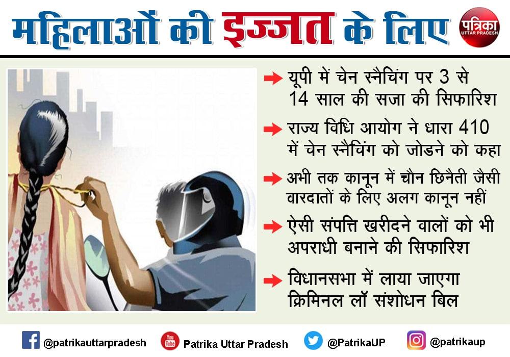 दरअसल चेन स्नेचिंग पुलिस के लिये हमेशा से सिरदर्द रहा है। इसके चलते महिलाएं भी असुरक्षित महसूस करती हैं। अक्सर ऐसी घटना के दौरान विरोध करने पर अपराधी हत्या करने तक से नहीं चूकते। राज्य विधि आयोग ने हर पहलुओं को समझने और गहन मंथन के बाद ये सिफारिश करते हुए यूपी सरकार को रिपोर्ट सौंप दी है।