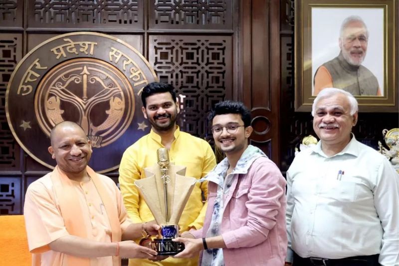 CM योगी से मुलाकात करते हुए इंडियन आइडल सीजन 13 विनर ऋषि सिंह