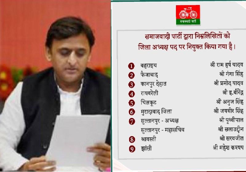 बहराइच जिलाध्यक्ष की जिम्मेदारी राम हर्ष यादव और फैजाबाद की जिम्मेदारी गंगा सिंह को दी गई है। इसके अलावा प्रमोद यादव को कानपुर देहात, ई बीरेंद्र को रायबरेली, अनुज सिंह को चित्रकूट और जयबीर सिंह को मुरादाबाद का जिलाध्यक्ष बनाया गया है। पृथ्वीपाल को सुलतानपुर का जिलाध्यक्ष बनाया गया है वहीं, सुलतानपुर महासचिव की जिम्मेदारी सलाउद्दीन को दी गई है।