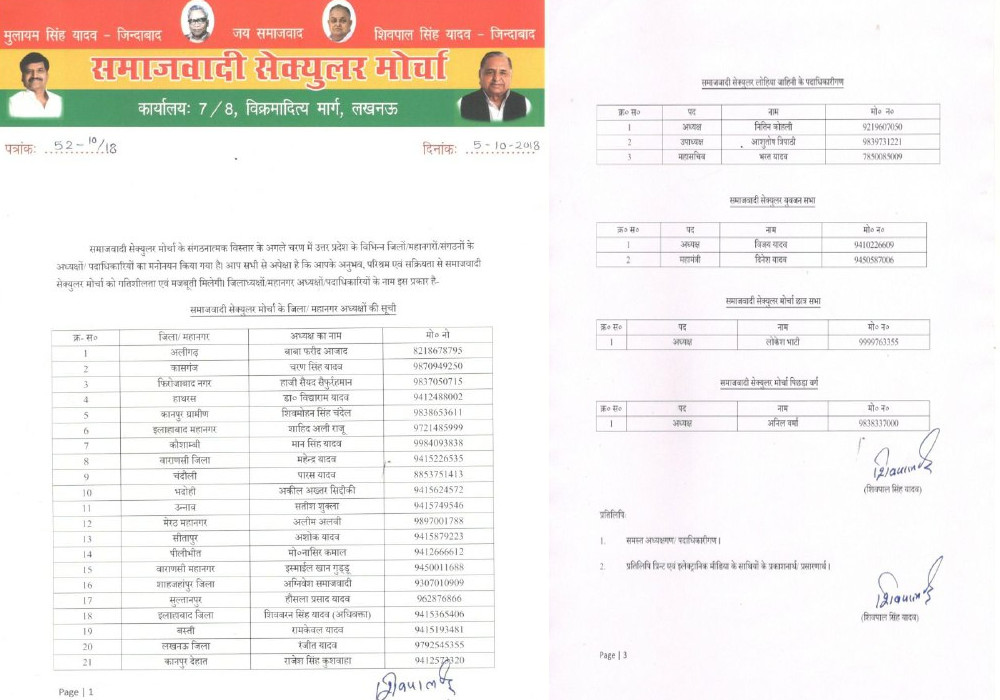 अब जाने समाजवादी सेक्युलर मोर्चा के जिला/महानगर महासचिवों के नाम व नंबर