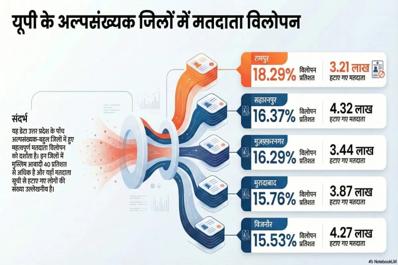 मुस्लिम बहुल जिलों में अपेक्षाकृत कम मतदाताओं के सूची से बाहर होने के संकेत हैं। इन जिलों में मुरादाबाद, रामपुर, बिजनौर, सहारनपुर, मुजफ्फरनगर शामिल हैं। कहां से कितने मतदाता हट सकते हैं, इस चार्ट में देखिए: