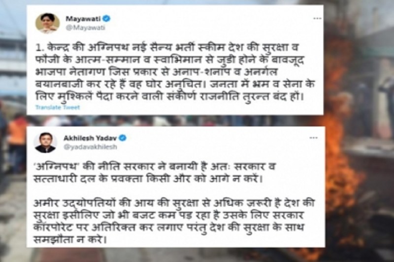 'अग्निपथ' योजना को लेकर बहुजन समाज पार्टी (बसपा) और समाजवादी पार्टी (सपा) ने केंद्र सरकार की आलोचना करते हुए कहा कि, इस योजना को जल्दबाजी में पेश किया गया है, सरकार को अहंकारी रवैया अपनाने से बचना चाहिए। बसपा सुप्रीमो मायावती ने सोमवार को एक ट्वीट में व्यक्त किया, नई अग्निपथ योजना ने देश को आश्चर्यचकित कर दिया है और इसे नोटबंदी और तालाबंदी की तरह जल्दबाजी में लागू किया जा रहा है, जिससे करोड़ों युवा और उनके परिवार प्रभावित हुए हैं और उनमें सरकार के प्रति गुस्सा है। सरकार को चाहिए कि अहंकारी रवैया अपनाने से बचे।