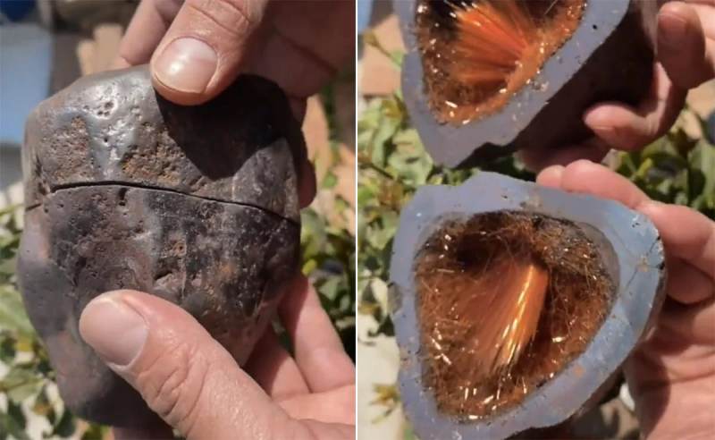 हैरान कर देने वाले इस वीडियो में एक शख्स अपने हाथों में एक छोटा सा पत्थर लिया नजर आ रहा है। वीडियो में दिखाई दे रहा पत्थर बीच से कटा हुआ है। वीडियो में आगे शख्स पत्थर को खोलकर दिखाता है, जिसे देखकर यकीनन आप भी दंग रह जाएंगे। दरअसल, पत्थर के खुलते ही अंदर एक चमकीली चीज दिखाई पड़ रही है।
