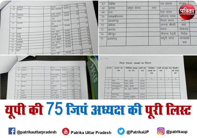 लखनऊ. UP Jila panchayat Adhyaksh chunav update. उत्तर प्रदेश में त्रिस्तरीय पंचायत चुनाव का आखिरी पड़ाव शनिवार को संपन्न हुआ। जिला पंचायत अध्यक्ष के चुनाव में भाजपा ने ऐतिहासिक जीत दर्ज की। कुल 75 जिलों में सत्ता पक्ष ने 67 पर पचरम लहराया। इनमें 21 पर पहले ही भाजपा प्रत्याशियों ने निर्विरोध जीत हासिल कर ली थी। समाजवादी पार्टी का जो हाल रहा, उसकी शायद उसने कल्पना भी नहीं की होगी। सपा को केवल पांच सीटों पर ही संतुष्ट होना पड़ा। कांग्रेस का सूपड़ा साफ हो गया। इसके अतिरिक्त रालोद, जनसत्ता दल, व निर्दलीय ने एक-एक सीट हासिल की। निम्म देखें सभी 75 जिलों के नवनिर्वाचित जिला पंचायत अध्यक्षों की सूची-