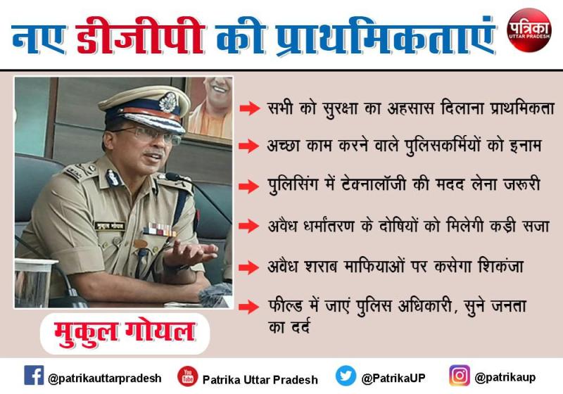 मुकुल गोयल ने शुक्रवार को प्रदेश के पुलिस विभाग के मुखिया का कार्यभार संभाल लिया। उन्होंने कहा कि कानून व्यवस्था को और सुदृढ़ बनाना ही प्राथमिकता है। सभी को सुरक्षा का अहसास दिलाना ही पुलिस की प्राथमिकता है।