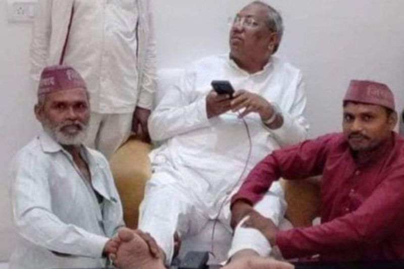मंत्री संजय निषाद कार्यकर्ताओं से पैर दबवाते हुए