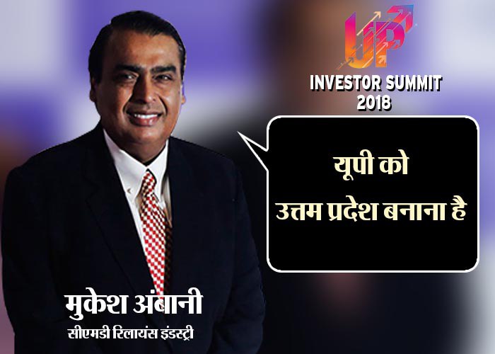 डिजिटल इंडिया को बढ़ावा मुकेश अंबानी ने कहा कि हमारी कोशिश डिजिटल इंडिया को आगे बढ़ाने की है। उन्होंने कहा कि 'उत्तर प्रदेश का सौभाग्य है कि कर्म योगी यहां के मुख्यमंत्री हैं। यूपी आना सबकी देश भक्ति पूर्ण जिम्मेदारी है। यूपी आगे बढ़ेगा तो देश का हर कोना आगे बढ़ेगा। देश के सबसे प्रसिद्ध प्रदेश को समृद्ध प्रदेश बनाना है तो प्रधानमंत्री के डिजिटल इंडिया का रास्ता चुनना होगा उन्होंने कहा कि मैं लखनऊ में आकर खुश हूं। किसी राजधानी को निवेश समिट के लिए इतना खूबसूरत सजा नहीं देखा। मोदी जी का सपना उत्तर प्रदेश को उत्तम प्रदेश बनाना है। हम सब मिल कर इसे पूरा करेंगे।' इस मौके पर उन्होंने सीएम योगी से चार वादे किए-