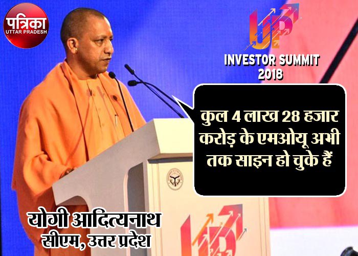 लखनऊ. बुधवार को राजधानी के इंदिरा गांधी प्रतिष्ठान में 'यूपी इन्वेस्टर्स समिट-2018' (UPIS) का शुभारंभ हुआ। प्रधानमंत्री नरेंद्र मोदी ने इन्वेस्टर्स मीट में उद्योगपतियों और विदेशी प्रतिनिधियों का स्वागत किया। यूपी इन्वेस्टर्स समिट-2018 में उद्योगपति मुकेश अंबानी , गौतम अडाणी, कुमार मंगलम बिड़ला समेत 5 हजार उद्योगपति शामिल हुये। पहले ही दिन 1045 मेमोरेंडम ऑफ अंडरस्टैंडिग (MOU) साइन हुए। इसके तहत यूपी में 4 लाख 28 हजार करोड़ का निवेश किया जाएगा। दो दिन चलने वाले इस इन्वेस्टर्स समिट में रोजगार , कपड़ा, डिफेंस, मैन्युफैक्चरिंग, एमएसएमआई जैसे 30 सेशन रखे गए हैं। योगी सरकार ने पर्यटन, स्टार्ट-अप, कृषि एवं फूड, टेक्सटाइल, प्रोसेसिंग और डेयरी में निवेश की नीति लाने की पहल है।