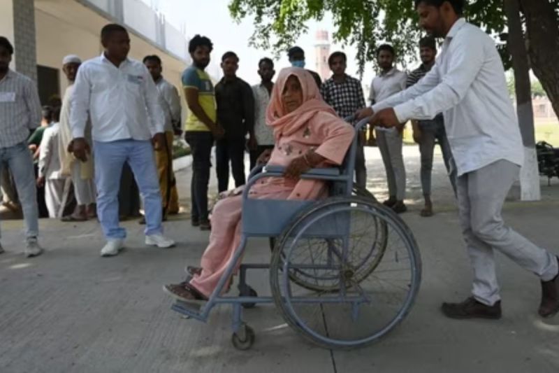बुजुर्ग महिला को व्हील चेयर पर मतदान स्थल ले जाते हुए