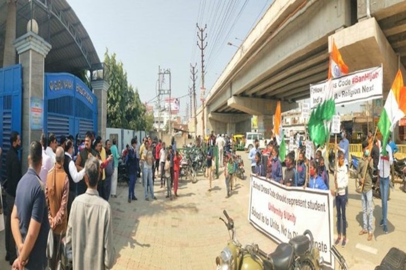 हिजाब मामले को लेकर वाराणसी के स्कूल के बाहर प्रदर्शन