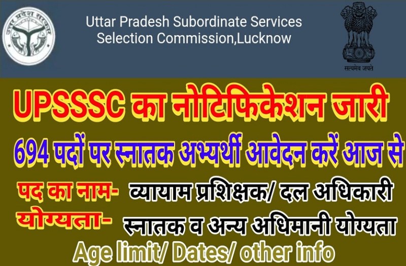 मुख्यमंत्री योगी आदित्यनाथ की सरकार में उप्र अधीनस्थ सेवा चयन आयोग का पुर्नगठन किया। इसके बाद नए बने आयोग की यह पहली नौकरी का विज्ञापन है। जिन पदों के लिए नौकरियां निकली हैं उनमें प्रान्तीय रक्षक दल और विकास दल एवं युवा कल्याण विभाग मेंव्यायाम प्रशिक्षक के 42 पद हैं। जबकि, 652 पद क्षेत्रीय युवा कल्याण एवं प्रादेशिक विकास दल अधिकारी के हैं। समूह ग के इन पदों पर भर्ती ऑनलाइन लिखित परीक्षा के आधार पर की जाएगी। इन पदों के लिए कोई साक्षात्कार नहीं होगा। अभ्यर्थियों को यूपी अधीनस्थ सेवा चयन आयोग की बेवसाइट पर ऑनलाइन आवेदन करना होगा। ऑनलाइन आवेदन की प्रक्रिया 13 मार्च से शुरू हो गई है। आवेदन की अन्तिम तारीख 23 अप्रैल है। फीस जमा करने की अंतिम तिथि 19 अप्रैल 2018 है।