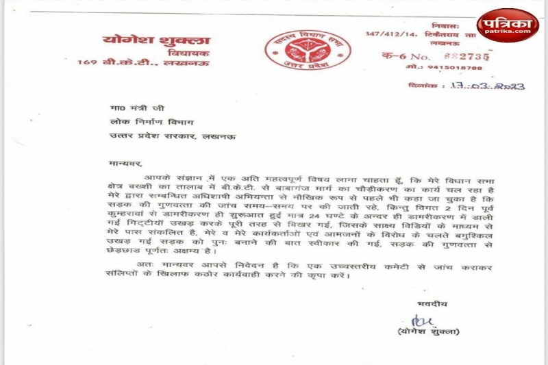 PWD मंत्री से सड़क में भ्रष्टाचार की शिकायत। भाजपा विधायक योगेश शुक्ला ने लिखा पत्र। विधायक ने लोक निर्माण मंत्री को लिखा पत्र। भ्रष्टाचार के खिलाफ कार्रवाई करने की मांग। लखनऊ की BKT सीट से विधायक हैं योगेश शुक्ला। 40 करोड़ की सड़क हाथ से उखड़ रही- विधायक।