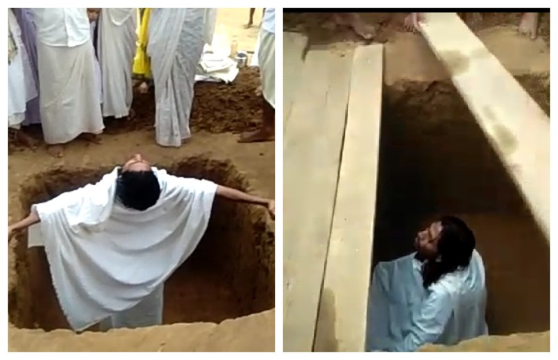 जानकारी के अनुसार, चमनदास जोशी (उम्र-30) नाम का एक साधक पिछले कई सालों से साधना करता था। पहली बार उसने 2015 में अपनी साधना के लिए उसने खुद को एक गढ्ढे में दफन कर 24 घंटे के लिए समाधि ले ली थी और सकुशल बेहोशी की हालत में बाहर निकल आया था।