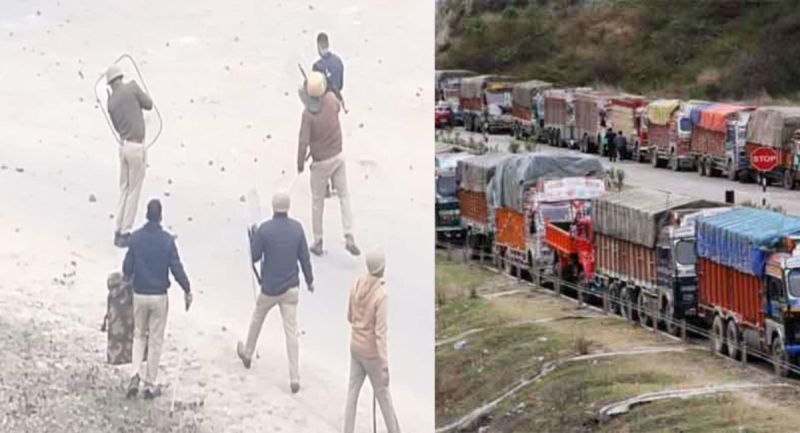 चालकों की तरफ किए जा रहे पथराव को रोकते हुई पुलिस।