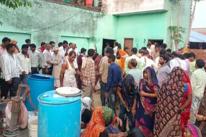 मैनपुरी में एक ही परिवार में छह लोगों की हत्या के बाद मौके पर जमा भीड़।