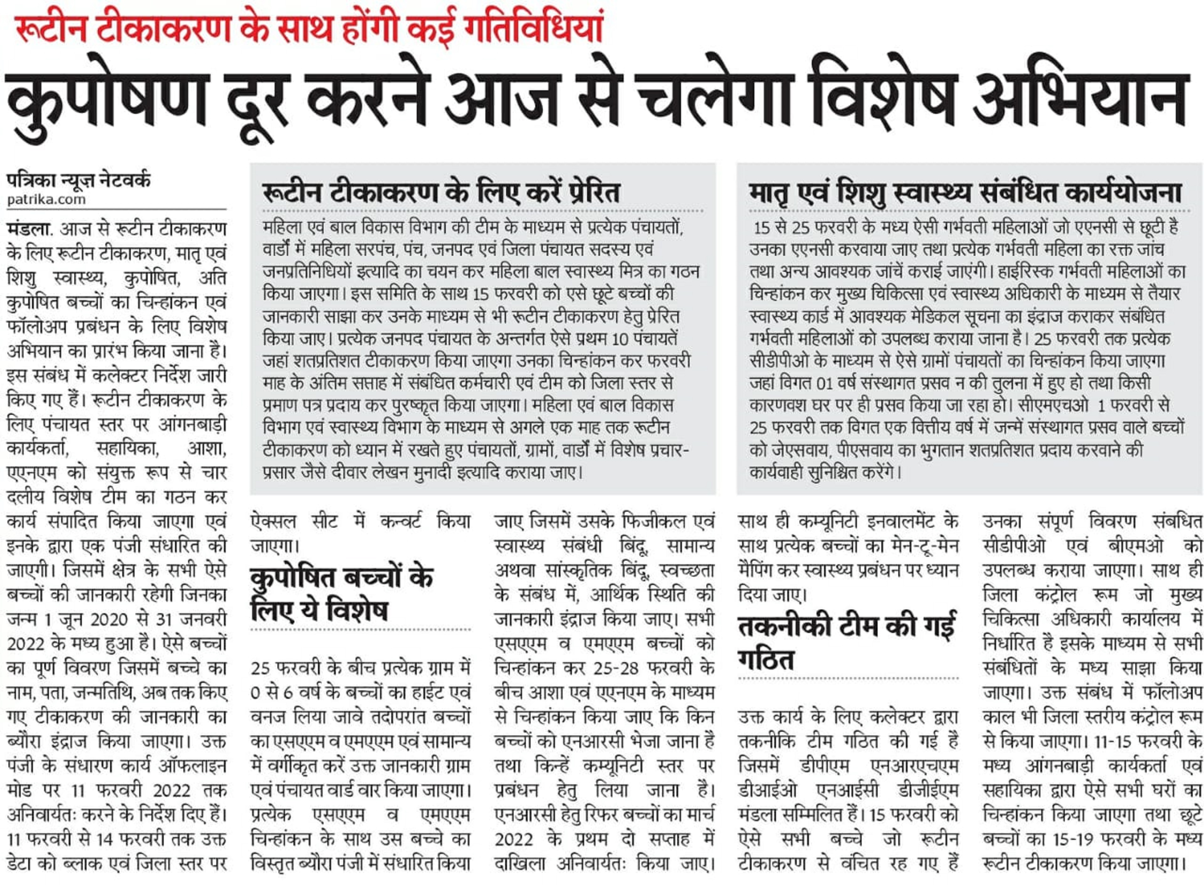 मंडला. आज से रूटीन टीकाकरण के लिए रूटीन टीकाकरण, मातृ एवं शिशु स्वास्थ्य, कुपोषित, अति कुपोषित बच्चों का चिन्हांकन एवं फॉलोअप प्रबंधन के लिए विशेष अभियान का प्रारंभ किया जाना है। इस संबंध में कलेक्टर निर्देश जारी किए गए हैं। रूटीन टीकाकरण के लिए पंचायत स्तर पर आंगनबाड़ी कार्यकर्ता, सहायिका, आशा, एएनएम को संयुक्त रूप से चार दलीय विशेष टीम का गठन कर कार्य संपादित किया जाएगा एवं इनके द्वारा एक पंजी संधारित की जाएगी। जिसमें क्षेत्र के सभी ऐसे बच्चों की जानकारी रहेगी जिनका जन्म 1 जून 2020 से 31 जनवरी 2022 के मध्य हुआ है। ऐसे बच्चों का पूर्ण विवरण जिसमें बच्चे का नाम, पता, जन्मतिथि, अब तक किए गए टीकाकरण की जानकारी का ब्यौरा इंद्राज किया जाएगा। उक्त पंजी के संधारण कार्य ऑफलाइन मोड पर 11 फरवरी 2022 तक अनिवार्यत: करने के निर्देश दिए हैं। 11 फरवरी से 14 फरवरी तक उक्त डेटा को ब्लाक एवं जिला स्तर पर ऐक्सल सीट में कन्वर्ट किया जाएगा।