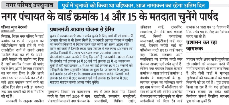 मण्डला/निवास. निवस नगर परिषद के वार्ड क्रमांक 14-15 में उपचुनाव का नोटिफिकेशन जारी होते ही सभी राजनीतिक दलों ने अपनी अपनी रणनीति तैयार कर ली है। अपने-अपने नेताओं को सक्रीय कर दिया है। वहीं स्थानीय नेतागण भी पार्षद पद के लिए अपनी किस्मत आजमाने का मन बना लिया है और अपने अपने स्तर पर जनसंपर्क कर रहे हैं। वहीं आज नमांकन फार्म भरने का अंतिम दिन होगा। वहीं 21 फरवरी तक नाम वापसी की तिथि निर्धारित की गई है। जानकारी के अनुसार तहसील मुख्यालय निवास का कायाकल्प करने के लिए वर्ष 2009 में ग्राम पंचायत निवास को नगर पंचायत के रूप में उन्नत किया गया। जिसमें खड़देवरी, रसलगंज, गज्जूदेवरी, आमाडोंगरी, सिविल लाईन, अंबेडकर वार्ड, राममंदिर, लधाटोला, जैन मंदिर वार्ड, खेरमाई वार्ड, निवसी पनवाटोला, बाजारवार्ड, आईटीआई वार्ड, पाठा वार्ड, देवगांव करौंदी वार्ड का परिसीमन करते हुए 15 वार्ड बनाए गए। जिनके मतदाता अपने मताधिकार का उपयोग करते नगर पंचायत अध्यक्ष एवं पार्षद चुनते हैं। लेकिन नगर पंचायत निवास के वार्ड क्रमांक 14 पाठा एवं वार्ड क्रमांक 15 देवगांव के मतदाताओं के द्वारा लगातार चुनाव का बहिष्कार करते हुए ग्राम पंचायत में संविलियन की मांग की जाती रही। लेकिन अब फिर से मतदान कर पार्षद चुनने का मौका वार्डवासियों को मिला है। वार्ड क्रमांक 14 पाठा एवं 15 देवगांव में रिक्त पार्षद पद के लिए उपनिर्वाचन कराए जा रहे हैं।
