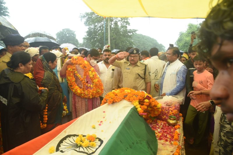 बीजाडांडी/निवास. भारत-बांग्लादेश सीमा पर तैनात जिले के चरगांव निवासी गिरजेश कुमार उद्दे ने देश की सुरक्षा करते हुए अपने प्राणों की आहुति दी। शहीद गिरजेश कुमार उद्दे का पार्थिव शरीर रविवार को सड़क मार्ग से उनके पैतृक गांव लाया गया। जिले में प्रवेश के साथ ही जवान को श्रद्धासुमन अर्पित करने जनप्रतिनिधि व नागरिक सड़क पर इंतजार करते नजर आए। बिछिया, अंजनियां, पदमी, कटरा बाइपास, कालपी आदि स्थानो में लोगों ने श्रद्धासुमन अर्पित किए। शहीद को गार्ड ऑफ ऑनर के साथ अंतिम विदाई दी गई। शहीद को उनके बड़े बेटे ने मुखाग्नि दी। झमाझम बारिश के बाद भी अंतिम यात्रा में जनसैलाब उमड़ पड़ा। केंद्रीय इस्पात और ग्रामीण विकास राज्यमंत्री फग्गन सिंह कुलस्ते सहित जिला प्रशासन और पुलिस के अधिकारी कर्मचारी शामिल हुए।