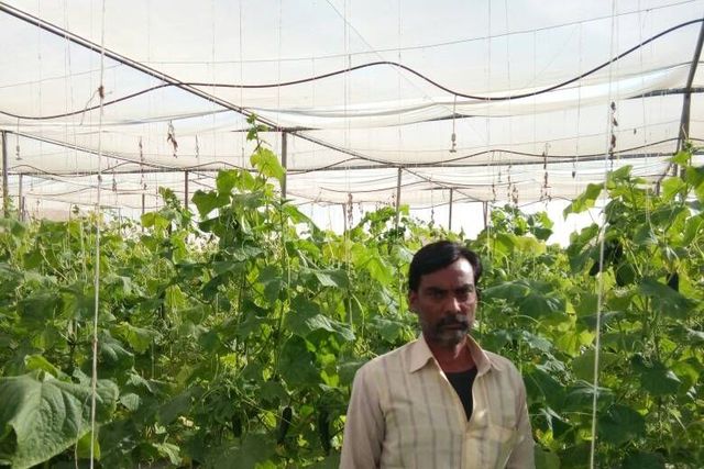 एमएन-०२२७-नेट हाऊस में लहलहाती फसल एवं उपस्थित दशरथ।