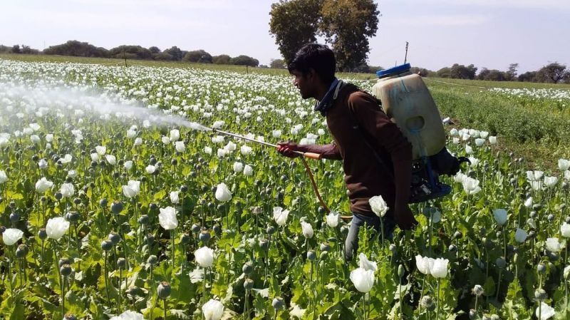 अफीम पर आया सफेद मस्सी का रोग, दवा छिडक़ने में लगे किसान