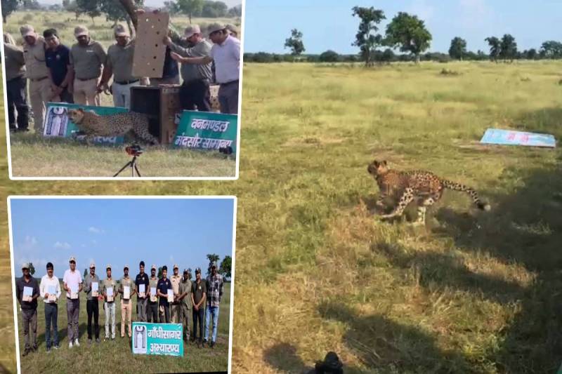 MP news: चीता धीरा को कूनो के जंगलों से गांधी सागर अभ्यारण्य में छोड़ा, पिंजरा खुलते ही रफ्तार से दौड़ी, इनसेट चीता धीरा और टीम(फोटो: patrika.com)