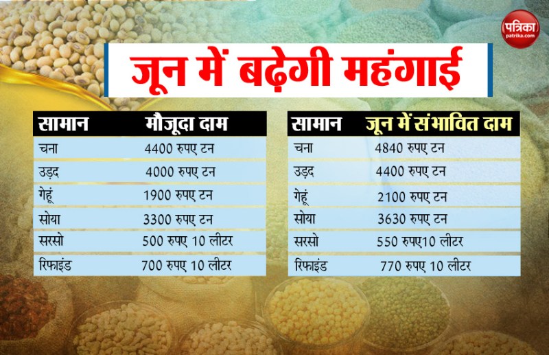 वहीं एक्सपर्ट के अनुसार इन्हीं सामानों की कीमतों में 10 फीसदी इजाफा होने की उम्मीद लगाई जा रही है। इसका मतलब ये हुआ कि जून के महीने में चना 4840 रुपए प्रति टन हो जाएगा। इसके अलावा उड़द की दाल की संभावित कीमत जून में 4400 रुपए प्रति टन हो जाएगी। अगर बात गेहूं की करें तो उसकी कीमत 2100 प्रति टन होने की उम्मीद लगाई जा रही है। इसके अलावा सरसो का तेल की कीमत भी बढऩे की संभावना है। जानकारों की मानें तो सरसों के तेल की कीमत 550 रुपए प्रति 10 लीटर होने के आसार हैं। वहीं दूसरी ओर रिफाइंड ऑयल की कीमत 770 रुपए प्रति 10 लीटर होने की उम्मीद है।