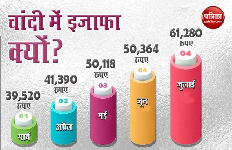 अगर अप्रैल के महीने से करें तो पूर्ण लॉकडाउन की शुरुआत हो चुकी थी। जिसकी वजह से चांदी की कीमत में 3.71 फीसदी का इजाफा देखने को मिला है। मई में चांदी की कीमत में और ज्यादा उछाल देखने को मिला। आंकड़ों के अनुसार मई के महीने में चांदी 22.27 फीसदी उछली। उस महीने सोने की कीमत में सोने की कीमत में तेज उछाल देखने को मिला था। कई निवेशकों की जब से बाहर होने के कारण चांदी की ओर रुख किया था। जून के महीने में अनलॉक 1 की शुरुआत हुई और भारत समेत दुनियाभर के शेयर बाजारों में तेजी का रुख रहा। वहीं दूसरी ओर रुपए के मुकाबले डॉलर के तेज रहने के कारण चांदी में ज्यादा इजाफा देखने को नहीं मिला।या कहें कि 0.50 फीसदी की तेजी के साथ सपाट रहा। बात जुलाई की करें तो अब तक चांदी की कीमतों में 22 फीसदी की तेजी देखने को मिल चुकी है। जानकारों की मानें तो जुलाई के महीने के आंकड़ें में इजाफा देखने को मिल सकता है।