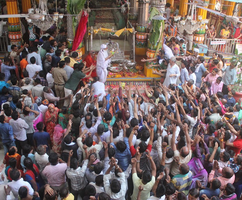 कृष्ण जन्मस्थान व द्वारिकाधीश उमड़ा रेलामथुरा। भारत विख्यात द्वारिकाधीश और श्रीकृष्ण जन्मस्थान का नंदोत्सव भी श्रद्धालुओं के लिए आकर्षण का केन्द्र बना रहा। द्वारिकाधीश में कई घंटे तक भक्तों के टोल बधाईयों पर थिरकते रहे। महिला-पुरुष भक्तों के बीच तो गायन की प्रतियोगिता सी होती नजर आई। मंदिर परिसर में खिलौने, माखन-मिश्री, मेवा व फलों की अटूट वर्षा हुई। उधर, श्रीकृष्ण जन्मस्थान का भागवत भवन भी नंदोत्सव की धूम में डूबा नजर आया। बीती रात जहां यहां जन्माभिषेक की झलक पाने को भक्तों का सैलाब आतुर था, वहीं शुक्रवार को नंदोत्सव का दिन उनके लिए सब कुछ अपने लाला पर लुटा देने वाला रहा। यहां भक्तों को उपहारों की अटूट वर्षा की गई। इन उपहारों को लूटने का भक्तों में ऐसा उत्साह दिखा, जैसे उनको अमृत मिल गया हो।