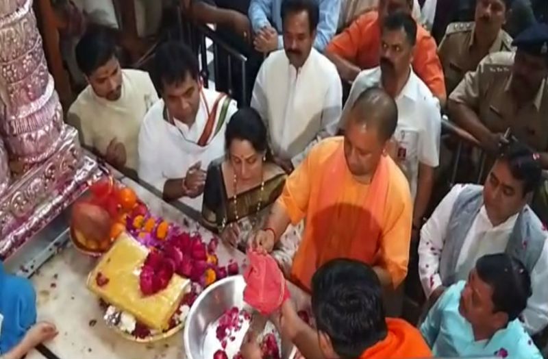 मथुरा। उत्तर प्रदेश के मुख्यमंत्री योगी आदित्यनाथ सोमवार सुबह करीब 11.40 बजे सांसद हेमा मालिनी व ऊर्जा मंत्री श्रीकांत शर्मा के साथ बांके बिहारी मंदिर पहुंचे। बिहारी जी के दर्शन कर उन्होंने आशीर्वाद लिया और चुनाव में जीत के लिए प्रार्थना की। मुख्यमंत्री हेलीकॉप्टर से पहले वृंदावन आए थे। वहां हेलीपैड पर उन्हें हेमा मालिनी ने रिसीव किया। उसके बाद वे सीधे सड़क मार्ग से मंदिर पहुंचे। इस बीच सुरक्षा के लिहाज से सड़क पर रक्षा बल तैनात किया गया था और यातायात रोक दिया गया था। मुख्यमंत्री के आगमन को लेकर आम श्रद्धालुओं के लिए मंदिर के गेट एक से प्रवेश को बंद कर दिया गया था। इसकी वजह से श्रद्धालुओं को थोड़ी परेशानी का सामना करना पड़ा। सीएम मंदिर में करीब बीस मिनट तक बांके बिहारी को निहारते रहे। इस बीच मंदिर सेवायत रजत गोस्वामी ने पूजा अर्चना कराई। 12.01 मिनट पर वे मंदिर से बाहर निकले। अब वे सेठ बी एन पौद्दार इंटर कॉलेज में जनसभा को संबोधित करेंगे।