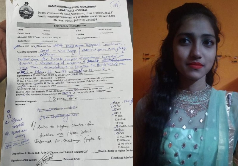 मथुरा के थाना राया की रहने वाली हिना नाम की लड़की की बुधवार को तबीयत खराब हुई जिसपर परिजनों ने उसे वहां के प्राइवेट डॉक्टर को दिखाया। डॉक्टरों ने युवती को मथुरा के लिए रेफर कर दिया। लड़की के परिजन मथुरा पहुंचे तो उन्होंने लड़की को वृंदावन के रामकिशन मिशन हॉस्पिटल में भेज दिया जहां डॉक्टरों ने हिना की जांच की। डॉक्टर ने पाया कि हिना में कोरोना वायरस के लक्षण। इस पर डॉक्टरों ने तुरंत युवती को दिल्ली के एम्स के लिए रेफर कर दिया। परिजन हिना को लेकर दिल्ली जाने वाले ही थे कि इसी बीच लड़की की मौत हो गई।
