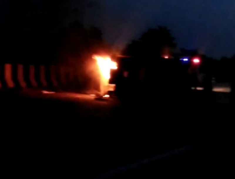 गाड़ी पलटने के बाद लगी आग