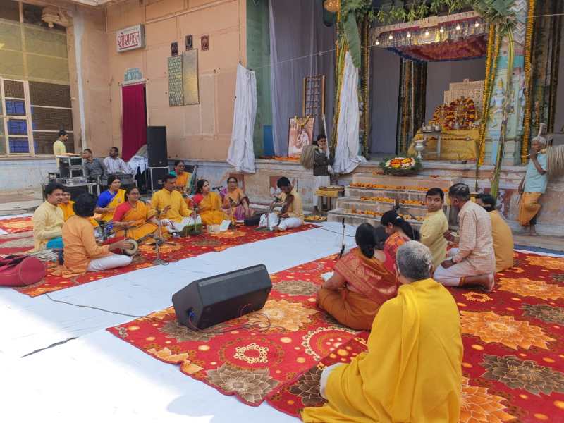 मंगलवार को वृंदावन स्थित भगवान गोदा रंगमन्नार मंदिर में जगद्गुरु त्यागराज स्वामी आराधन महोत्सव आयोजन बडे धूमधाम से किया गया। मंदिर में आरती के बाद दिल्ली के हंसिनी समूह द्वारा जगद्गुरु स्वामी त्यागराज जी की सुप्रसिद्ध पंचरत्न कृति का गायन किया। कर्नाटक संगीत शैली के जगद्गुरु त्यागराज स्वामी के 174 वें आराधन उत्सव पर संगीत जगत के नामचीन सितारों ने अपनी संगीत साधना से सन्त त्यागराज स्वामी को भावजंलि अर्पित की।जिसका नगर के संगीतप्रेमियों ने जमकर लुत्फ उठाया। दक्षिणात्य शैली के विशालतम श्री रंग मन्दिर का परिसर बसन्त पंचमी पर्व पर संगीत लहरियो से गुलजार रहा ,मौका था दक्षिण भारत संगीत के संवर्धक सन्त त्यागराज स्वामी के आराधन उत्सव पर आयोजित संगीत सन्ध्या का. श्री रामभक्ति के परिचायक सन्त त्यागराज स्वामी ने 18वी शताब्दी में करीब आठ सौ से अधिक रामभक्ति से परिपूर्ण पदों की रचना कर पूरे देश मे कर्नाटक संगीत को पुष्ट किया। श्री रँगमन्दिर प्रबंधन द्वारा प्रथम बार इस संगीत महोत्सव का भव्य आयोजन किया गया। जिसमें नामचीन संगीतज्ञों ने सन्त त्यागराजा की महत्वपूर्ण कृति पंचरात्री पर आधारित रचनाये प्रस्तुत की। शुभारंभ ठाकुर श्री गोदारनगमन्नार भगवान के अर्चन से हुआ।