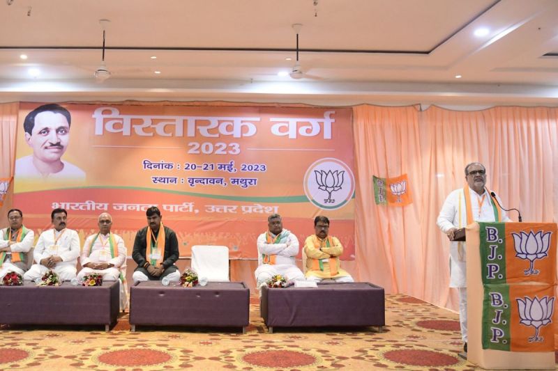 मथुरा में विस्तारकों को संबोधित करते भूपेंद्र सिंह।