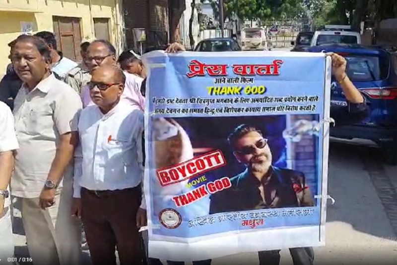 मथुरा में रविवार को अखिल भारतीय चित्रगुप्त महासभा के बैनर तले अजय देवगन की फिल्म का विरोध किया गया। दर्जनों की संख्या में एकत्रित हुए लोगों ने अजय देवगन की फ़िल्म का विरोध किया। विरोध प्रदर्शन में शामिल होने आए व्यक्तियों ने अपना आक्रोश व्यक्त किया। लामबंद हुए चित्रगुप्त समाज के लोगों ने भगवान चित्रगुप्त की अपमान किए जाने को लेकर अपना आक्रोश व्यक्त करते हुए कहा है कि, थैंक गॉड फिल्म से हिंदू देवी देवताओं का अपमान करने वाला सीन को हटाया जाए। लोगों ने चेतावनी दी है कि, यदि फिल्म का सीन नहीं शीघ्र नहीं हटाया गया या हिंदू देवी देवताओं को अपमानित करने वाला सीन नहीं काटा गया तो चित्रगुप्त कायस्थ महासभा के बैनर तले देशव्यापी एक बड़ा आंदोलन करेगा।