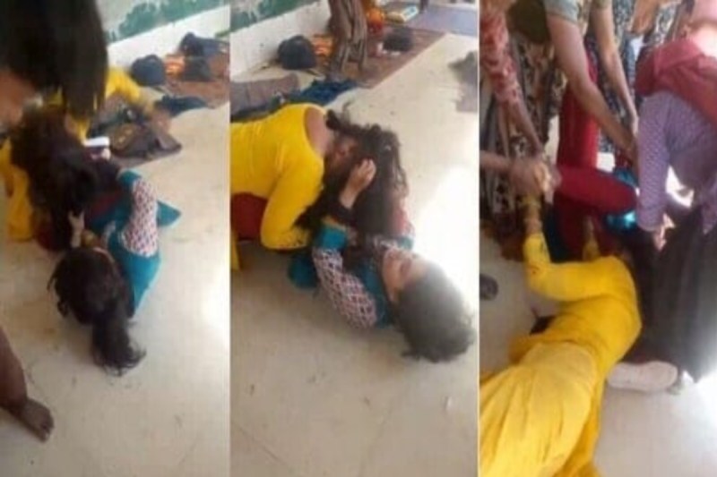 शिक्षिका और कार्यकत्रियों के बीच मारपीट का एक दृश्य